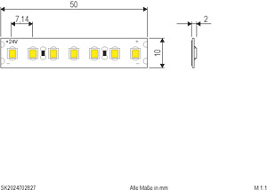Der LED-Strip kann in jeder Wunschlänge (Angabe in Meter), bis maximal 50m, unter Beachtung des Teilungsmaßes von 50mm konfektioniert werden. Die maximale Einspeiselänge bei einseitiger Einspeisung beträgt 5m. Der konfektionierte Strip wird standardmäßig einseitig mit einer 0,5m langen Anschlussleitung (Kabelquerschnitt: 0,3mm²) ausgeliefert. Wichtig: Um ein Überhitzen des Strips zu vermeiden, darf dieser nur auf wärmeleitenden Untergründen verbaut werden, vorzugsweise auf bzw. in Aluminiumprofilen. Exaktes Binning erlaubt Farbtoleranzen von maximal +/-50K. Die Lichtausbeute beträgt 1532lm pro Meter.
