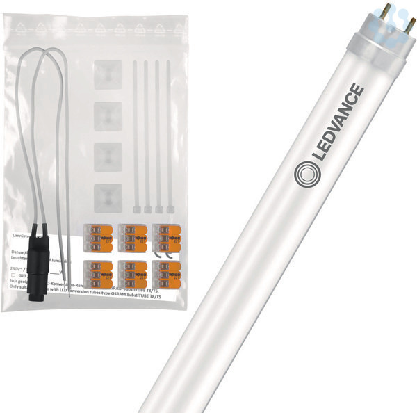 Leistungsstarke LED-Röhren für elektromagnetische Vorschaltgeräte (KVG/VVK), Splitterschutz inklusive Umrüstkit für zweiflammige Leuchten. Produkteigenschaften: Enthält 10 LED TUBE T8 EM Ultra Output S LED-Röhren und 5 Umrüstkits für zweiflammige Leuchten. Umrüstkit enthält alle für die Umverdrahtung benötigten Materialen. Detaillierte Schritt-für-Schritt-Anleitung für garantierte TÜV-Zertifizierung verfügbar. LED-Ersatz für herkömmliche T8-Leuchtstofflampen mit G13 Sockel in KVG Leuchten oder an Netzspannung. Flimmerarm nach EU 2019/2020 (SVM ≤0,4 / PstLM ≤ 1). Lampenröhre aus Glas mit Splitterschutz für Anwendungen z.B. in der Lebensmittelindustrie. ENEC 10 VDE-Zeichen. Für besonders homogene Ausleuchtung. Lebensdauer: bis zu 75.000 h. Schutzart: IP20. Quecksilberfrei und RoHS-konform. Produktvorteile: Umbau benötigt nur ca. 5 Minuten pro Leuchte. Keine EVG-Kompatibilitätsprobleme. Keine Wartung des EVGs mehr notwendig. Kein Durchhängen dank Glasröhre. Splitterschutz dank spezieller PET-Beschichtung. Unterstützen bei der Umsetzung der HACCP-Konzepte von der Produktion bis hin zur Warenpräsentation. Sehr hohe Schaltfestigkeit. Hoher Lichtstrom für anspruchsvolle Beleuchtungsaufgaben. Energieeinsparung von bis zu 62 % (gegenüber T8 Leuchtstofflampe). Volle Helligkeit ohne Aufwärmphase, deswegen ideal geeignet in Kombination mit Sensorik. Auch geeignet für den Betrieb bei niedrigen Temperaturen. Anwendungsgebiete: Allgemeinbeleuchtung in Umgebungstemperaturen von -20…+50°C. Beleuchtung in industrieller Fertigung. Verkehrszonen und Korridore. Supermärkte und Warenhäuser. Industrie.