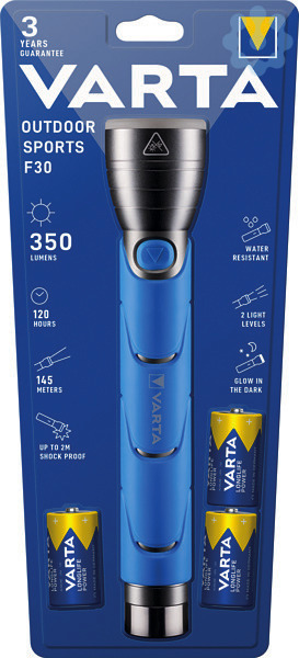 Die VARTA Outdoor Sports Flashlight ist eine robuste Leuchte in ansprechendem Design. Die Cree 5W Hochleistungs-LED bietet zwei Leuchtstärken (hoch, niedrig). Dank des photolumineszenten Materials auf dem Kopf (Angel Eye) ist die Taschenlampe im Dunkeln leicht zu finden. Das Gehäuse aus eloxiertem Aluminium (Typ II) und einem gummierten Griff ist spritzwassergeschützt und stoßfest. Die Leuchte hat einen Flaschenöffner in der Endkappe integriert. Die Leuchte verfügt über ein Handschlaufe zur bequemen Handhabung. Ideale Einsatzgebiete sind: Werkstatt, Garage, Wohnwagen, Boot, Auto, Schuppen oder im Garten sowie Indoor- und Outdoor-Aktivitäten wie Angeln, Wandern, Camping, Grillen, Reparaturen und Höhlenerkundung, Notfälle und Stromausfälle.