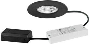 LED-Einbaudownlightset, IP65, DALI dimmbar, mit Anschlussbox, strukturschwarz, rund. Ausgeführt in kompakter Bauform für werkzeuglose Schnellmontage zum Deckeneinbau. Set inkl. Konverter für 230 V-Netzspannung, DALI-2 dimmbar, Maße Konverter: L 130 x B 42 x H 22 mm Montageart: Einbaumontage, Montageort: Deckenmontage, Material: Aluminium / Silikonkautschuk / PMMA, Schutzart raumseitig: nach DIN EN 60529: IP65, Schutzklasse: (EN 61140) II, Spannung: 230V AC 50Hz, Leistung: 7 W, Anzahl der Leuchtmittel / Fassungen: 1 Stück, Lichtstrom: 620 lm, Farbtemperatur: 3.000 K, Abstrahlwinkel: 36°, Verstellbarkeit: nicht verstellbar, Mit Betriebsgerät: Ja, Dimmbar: Ja, Art der Dimmung: DALI-2.