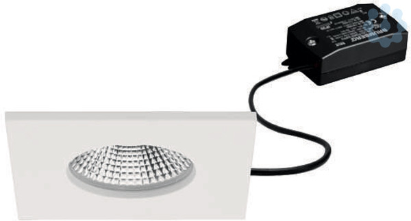 LED-Einbaudownlightset, IP65, schaltbar, strukturweiß, quadratisch. Ausgeführt in kompakter Bauform für werkzeuglose Schnellmontage zum Deckeneinbau. Set inkl. Konverter für 230 V-Netzspannung, schaltbar, Maße Konverter: L 68 x B 35 x H 21 mm Montageart: Einbaumontage, Montageort: Deckenmontage, Material: Aluminium / Silikonkautschuk / PMMA, Schutzart raumseitig: nach DIN EN 60529: IP65, Schutzklasse: (EN 61140) II, Spannung: 230V AC 50Hz, Leistung: 7 W, Anzahl der Leuchtmittel / Fassungen: 1 Stück, Lichtstrom: 620 lm, Farbtemperatur: 3.000 K, Abstrahlwinkel: 36°, Verstellbarkeit: nicht verstellbar, Mit Betriebsgerät: Ja, Dimmbar: Nein, Art der Dimmung: schaltbar.