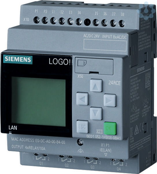 LOGO! 24RCE, Logikmodul,Display SV/E/A: 24V AC/DC 24V/Relais, 8 DE/4 DA, SP. 400 Blöcke, modular erweiterbar, Ethernet, integr. Web-Server, Datalog, benutzerdefinierte Web-Seiten, Standard microSD-Karte für LOGO! Soft Comfort ab V8, ältere Projekte ablauffähig Die LOGO! 8 Grundgeräte mit 8 digitalen Ein- und 4 digitalen Ausgängen und ihrer geringen Einbaubreite von 72 mm haben viele bekannte Funktionen (Stromstoßrelais, Treppenhausautomat, Hilfsschütz, Zeitrelais etc.) integriert, die vielfältig miteinander kombiniert werden können. Schaltprogramme können einfach am PC erstellt und simuliert werden. Die jeweils integrierte Ethernet-Schnittstelle erlaubt die Kommunikation von bis zu neun LOGO! 8 Modulen bzw. SIMATIC S7 Systemen. Mit dem ebenfalls integrierten Webserver können angeschlossene Verbraucher über WLAN bzw. Internet überwacht und gesteuert werden. Dabei können die Webseiten vom Anwender selbst gestaltet werden, auch ohne HTML-Kenntnisse. Über Zusatzmodule ist GSM- bzw. GPS-Kommunikation sowie die Einbindung in ein KNX-Gebäudeleitsystem möglich. LOGO! 8 Grundgeräte sind mit und ohne Display für unterschiedliche Eingangsspannungen sowie mit Transistor- oder Relaisausgängen (bis 10 A Schaltleistung) verfügbar. Mit entsprechenden Zusatzmodulen sind sie modular erweiterbar auf bis zu 24 DE / 20 DA (8 AE / 8 AA). LOGO! 8 lässt sich auch um ein externes Textdisplay für aussagekräftige Meldungen im Klartext erweitern. Die Hintergrundfarbe ist für optische Hervorhebungen wählbar. Diverse LOGO! Power Module zur Stromversorgung sind ebenfalls verfügbar.