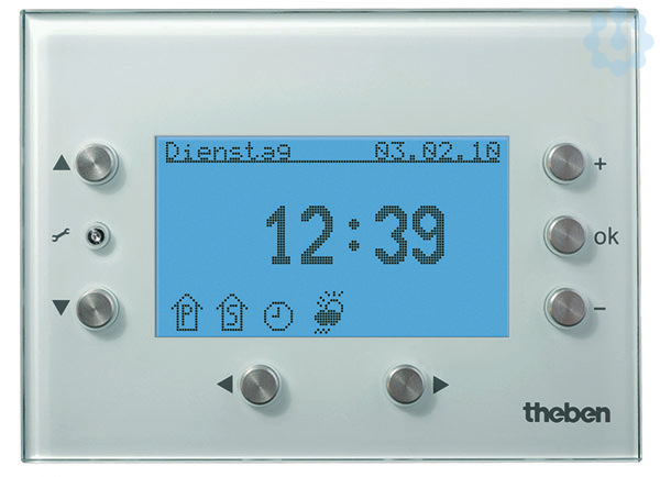 Display mit Multifunktion in flachem Glas-Design, UP-Montage, Farbe weiß, Display mit 6 verschiedenen beleuchteten Anzeigeseiten a 8 Zeilen, Anzeige von Uhrzeit, Wochentag, Datum sowie Zentral-und Automatikfunktionen, Anzeige von aktuellen Wetterdaten sowie Min./Max-Werte in Kombination mit LUXOR 411 u. 412, Display mit Hinterleuchtung, Favoritenseite wählbar aus 6 Seiten, 8-Kanal-Zeitschaltuhr, in Kombination mit einem Raumthermostat RAMSES für Heizungs-Temperaturabsenkung