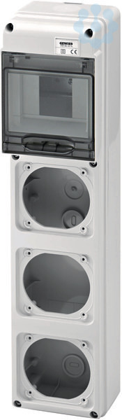 IEC Leergehaeuse fuer Steckdosenkombinationen. Mit Flanschoeffnungen zur einfachen und schnellen Montage von IEC Anbausteckdosen. 3 Flansche (LxB) 85x75 mm fuer IEC Anbausteckdosen 16A Abdeckrahmen der Baureihe System GW27401/GW27403. 1 Blindflansch ist im Lieferumfang enthalten. Verteilerraum unter transparenter Abdeckung zur freien Bestueckung mit Reiheneinbaugeraeten. Gehaeuseschutzart IP65 (Die Schutzart wird durch die Verwendung der Steckdosen und Leitungseinfuehrungen bestimmt). Das Gehaeuse wird durch einen gelben Tragrahmen aus Weichkunststoff zusaetzlich geschuetzt.