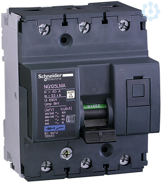 Leistungsschalter Acti 9 NG125LMA, 50kA (IEC/EN 60947-2). 2-polig, Nennstrom 25A, MA-Charakteristik, Betriebsspannung (Ue) 380-415V AC, Isolationsspannung (Ui) 690V AC. Schutz des Stromkreises gegen Kurzschlussströme. Schutz des Stromkreises gegen Überlastströme. Die Auslösung wird durch die Mittelstellung des Schaltknebels und durch eine rote, mechanische Anzeige an der Gerätefrontseite angezeigt. Testtaste zur Überprüfung des Auslösemechanismus. Einspeisung von oben oder unten. Sprungschaltung für verschleißarmes Schalten der Kontakte. Technologie der Auslöseeinheit- thermomagnetisch. Zusätzlich anreihbare Hilfsmodule (optional)- Anzeige von Schaltstellung, Fehlerauslösung, Arbeitsstromauslöser, Unterspannungsauslöser, Überspannungsauslöser. Der NG125LMA Leistungsschalter erfüllt folgende Normen- IEC/EN 60947-2.