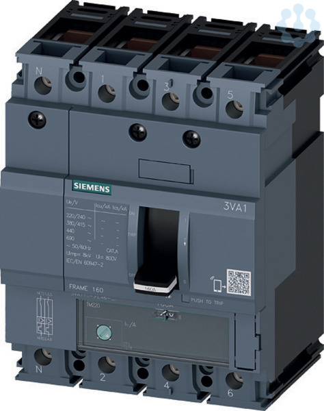 Leistungsschalter 3VA1 IEC Frame 160 Schaltvermögenklasse M Icu=55kA @ 415V 4-polig, Anlagenschutz TM220, ATFM, In=40A Überlastschutz Ir=28A...40A Kurzschlussschutz Ii=10 x In N-Leiterschutz 100% Klemmenanschluss Kompaktleistungsschalter 3VA1 für Starterschutz. Die Kompaktleistungsschalter 3VA von Siemens als wichtiger Bestandteil der SENTRON Schutzkomponenten für industrielle Anwendungen sowie für Anwendungen im Infrastrukturbereich bieten effektiven Anlagen -, Starter- und Motorschutz durch sicheres Abschalten im Überlast- und Kurzschlussfall. Die Kompaktleistungsschalter 3VA setzen dabei Maßstäbe in Flexibilität und modularer Zubehörvielfalt. Einheitliches Zubehör für mehrere Baugrößen über alle Baureihen des Kompaktleistungsschalters 3VA1 und 3VA2. Diese Variante des Kompaktleistungsschalters 3VA zeichnet sich vor allem aus durch: 1. Kompakte Bauform. 2. Verfügbar als Variante für Starterschutz zur Absicherung von elektrischen Motoren gegen Kurzschluss. 3. Verfügbar als 3-polige Ausführung. 4. Abhängig von der Baugröße: Bemessungsbetriebsstrom von 32 A....200 A. 5. Schaltvermögen von 55 kA ... 70 kA bei 415 V. 6. Montage in Festeinbau und Stecktechnik möglich. 7. Die Baureihe verfügt über einen Thermisch-magnetischer Überstromauslöser 8. Modulares und einfach zu montierendes internes Zubehör mit vielfältigen Funktionen. 9. Durchgängige Zubehörplattform über alle Kompaktleistungsschalter 3VA.