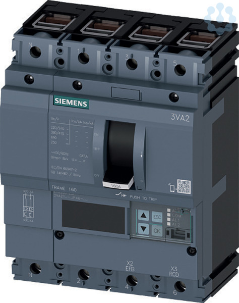 Leistungsschalter 3VA2 IEC Frame 160 Schaltvermögenklasse C Icu=110kA @ 415V 4-polig, Anlagenschutz ETU550, LSI, In=100A Überlastschutz Ir=40A...100A Kurzschlussschutz Isd=0,6..10x In, Ii=1,5..12x In N-Leiterschutz einstellbar (OFF, bis 160%) Klemmenanschluss Kompaktleistungsschalter 3VA2 mit ETU 8-er Reihe für Anlagenschutz. Die Kompaktleistungsschalter 3VA von Siemens als wichtiger Bestandteil der SENTRON Schutzkomponenten für industrielle Anwendungen sowie für Anwendungen im Infrastrukturbereich bieten effektiven Anlagen -, Starter- und Motorschutz durch sicheres Abschalten im Überlast- und Kurzschlussfall. Die Kompaktleistungsschalter 3VA setzen dabei Maßstäbe in Flexibilität und modularer Zubehörvielfalt. Einheitliches Zubehör für mehrere Baugrößen über alle Baureihen des Kompaktleistungsschalters 3VA1 und 3VA2. Diese Variante des Kompaktleistungsschalters 3VA zeichnet sich vor allem aus durch: 1. Kompakte Bauform. 2. Verfügbar als Variante für Anlagenschutz und Generatorschutz. 3. Verfügbar als 3- und 4-polige Ausführung. 4. Vier Schaltleistungsklassen von 55 kA ... 150 kA bei 415 V. 5. Abhängig von der Baugröße: Bemessungsstrom 25 A.630 A. 6. Montage in Festeinbau, Stecktechnik, Einschubtechnik möglich. 7. Die Baureihe verfügt über einen Elektronische Überstromauslöser. 8. Verfügt über ein integriertes Display zur Messwertanzeige. 9. Integrierte Messfunktion und optionale Kommunikationsanbindung über Modbus TCP, Modbus RTU, PROFINET und PROFIBUS. 10. Modulares und einfach zu montierendes internes Zubehör mit vielfältigen Funktionen.