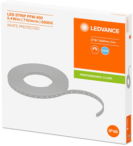 Leistungsstarke IP66 geschützte LED-Bänder mit 600 lm/m für anspruchsvolle Anwendungen. Produkteigenschaften: Flexibles und teilbares LED-Band. Kleinste teilbare Einheit: 100 mm. Lebensdauer (L70/B50): bis zu 35.000 h bei Tc max.: 75°C. Lichtstrom: 600 lm/m. Farbwiedergabeindex Ra: > 80. Anfängliche Farbkonsistenz: ≤ 4 SDCM (Schwellwerteinheit). Großes Spektrum an Farbtemperaturen: von Warmweiß bis kühles Tageslicht. Schutzart: IP66. Dimmbar mit geeigneten Treibern, siehe auch www.ledvance.de/dim). UV-Beständigkeit (nach IEC 60068-2-5). Salznebelbeständigkeit (nach IEC 60068-2-52). Produktvorteile: Große Designfreiheit dank langer, flexible LED-Lichtbänder. Einfache Installation, werkzeugloser Anschluss. Einfache Montage an vielen glatten Oberflächen durch selbstklebendes Klebeband. Geeignet für Verwendung in feuchten Umgebungen dank hoher Schutzart. Maximale Flexibilität dank großer Auswahl an Zubehör. Einfacher Anschluss durch beidseitig integrierte Kabel. Anwendungsgebiete: Allgemeine Innenbeleuchtung. Allgemeine Außenbeleuchtung. Industrie. Büros, Verkaufs- und Konferenzräume. Architekturbeleuchtung. Dekorative Beleuchtung. Technische Ausstattung: Verbindungen, Profile und Abdeckungen für verschiedene Montagemöglichkeiten verfügbar. Endkappen müssen separat bestellt werden.