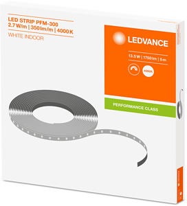 Leistungsstarke LED-Bänder mit 300 lm/m für anspruchsvolle Anwendungen. Produkteigenschaften: Flexibles und teilbares LED-Band. Kleinste teilbare Einheit: 100 mm. Lebensdauer (L70/B50): bis zu 35.000 h bei Tc max.: 75°C. Lichtstrom: 300 lm/m. Farbwiedergabeindex Ra: > 80. Anfängliche Farbkonsistenz: ≤ 4 SDCM (Schwellwerteinheit). Großes Spektrum an Farbtemperaturen: von Warmweiß bis kühles Tageslicht. Dimmbar mit geeigneten Treibern, siehe auch www.ledvance.de/dim). Produktvorteile: Große Designfreiheit dank langer, flexible LED-Lichtbänder. Einfache Installation, werkzeugloser Anschluss. Einfache Montage an vielen glatten Oberflächen durch selbstklebendes Klebeband. Maximale Flexibilität dank großer Auswahl an Zubehör. Einfacher Anschluss durch beidseitig integrierte Kabel. Anwendungsgebiete: Allgemeine Innenbeleuchtung. Industrie. Büros, Verkaufs- und Konferenzräume. Architekturbeleuchtung. Dekorative Beleuchtung. Technische Ausstattung: Verbindungen, Profile und Abdeckungen für verschiedene Montagemöglichkeiten verfügbar.