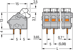 Leiterplattenklemme; Drücker; 2,5 mm²; Rastermaß 5/5,08 mm; 36-polig; CAGE CLAMP®; Brückungsmöglichkeit; 2,50 mm²; grau