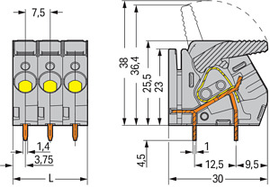 Leiterplattenklemme; Hebel; 6 mm²; Rastermaß 7,5 mm; 3-polig; CAGE CLAMP®; Brückungsmöglichkeit; 6,00 mm²; grau