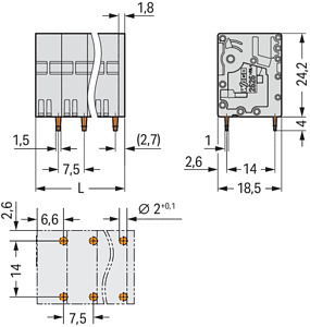 Leiterplattenklemme; 6 mm²; Rastermaß 7,5 mm; 2-polig; Push-in CAGE CLAMP®; 6,00 mm²; grau