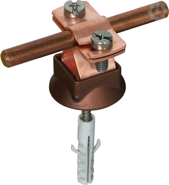 Leitungshalter DEHNhold mit geschlitztem Überleger, zum Befestigen von Rundleitern. Einsetzbar für verschiedene Werkstoffe z. B. Al, NIRO, St/tZn und Cu, feste Leitungsführung. Ausführung mit Innengewinde, vormontiert mit Schraube, Kunststoffsockel und Dübel.