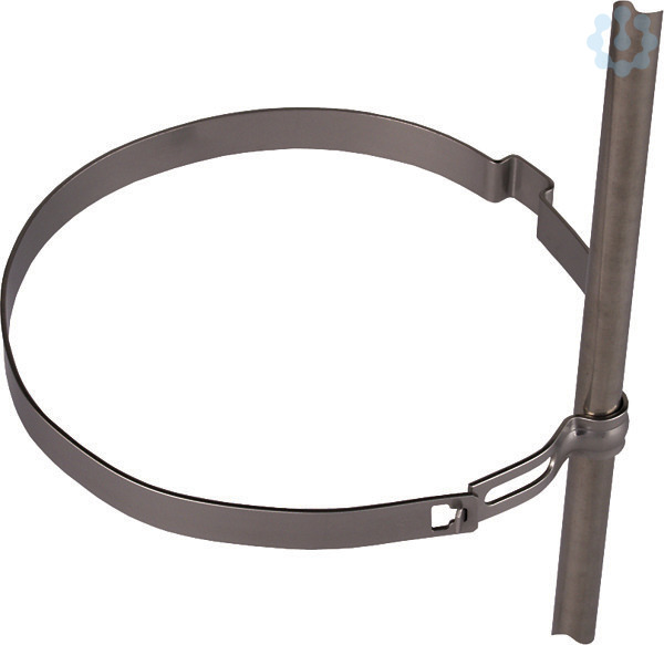 Leitungshalter zum Verlegen von Ableitungen an Regenfallrohren. Ausführung Typ PS schraubenlos, mit Prägungen für Zange, fester Leitungsführung.