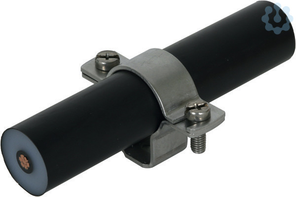 Leitungshalter für HVI power Leitung, mit Zweischrauben-Überleger, Ausführung NIRO, z. B. für Wandmontage.