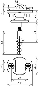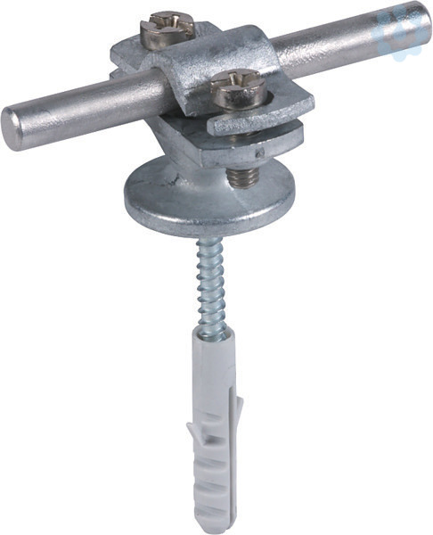 Leitungshalter mit Überleger und Abdeckbund, für das Verlegen von Leitungen. Mit geschlitztem Überleger und fester Leitungsführung. Ausführung mit Innengwinde, vormontiert mit Schraube und Dübel.