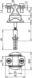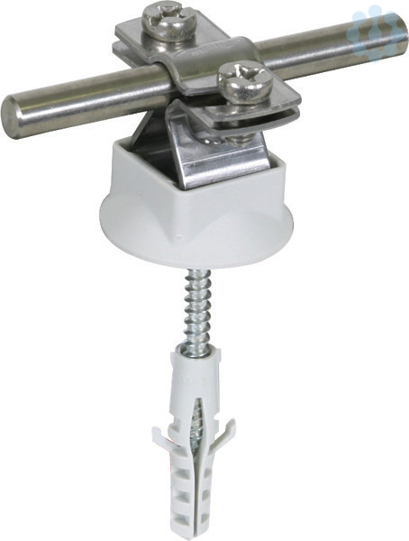 Leitungshalter DEHNhold mit geschlitztem Überleger, zum Befestigen von Rundleitern. Einsetzbar für verschiedene Werkstoffe z. B. Al, NIRO, St/tZn und Cu, feste Leitungsführung. Ausführung mit Innengewinde, vormontiert mit Schraube, Kunststoffsockel und Dübel.