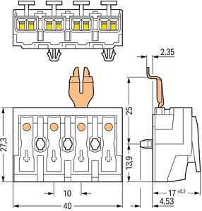 Leuchtenanschlussklemme; Drücker extern; mit abgewinkeltem PE-Rastkontakt; 4-polig; Leuchtenseite: für eindrähtige Leiter; Inst.-Seite: für alle Leiterarten; max. 2,5 mm²; Umgebungstemperatur max. 85 °C (T85); 2,50 mm²; weiß