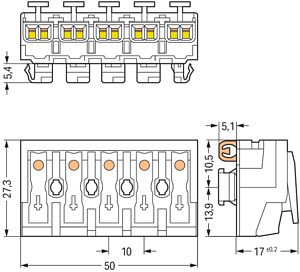 Leuchtenanschlussklemme; Drücker extern; für Linect®; mit PE-Direktkontakt; L´-N´-L-PE-N; 5-polig; Kod. L; Leuchtenseite: für eindrähtige Leiter; Inst.-Seite: für alle Leiterarten; max. 2,5 mm²; Umgebungstemperatur max. 85 °C (T85); 2,50 mm²; weiß