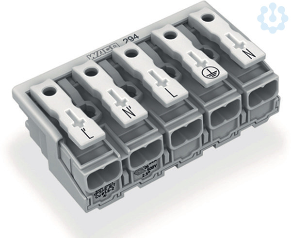Leuchtenanschlussklemme; Drücker extern; ohne PE-Kontakt; L´-N´-L-PE-N; 5-polig; Leuchtenseite: für eindrähtige Leiter; Inst.-Seite: für alle Leiterarten; max. 2,5 mm²; Umgebungstemperatur max. 85 °C (T85); 2,50 mm²; weiß