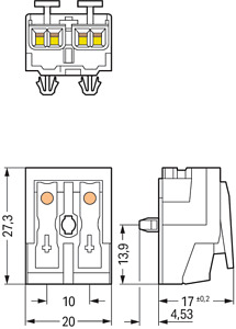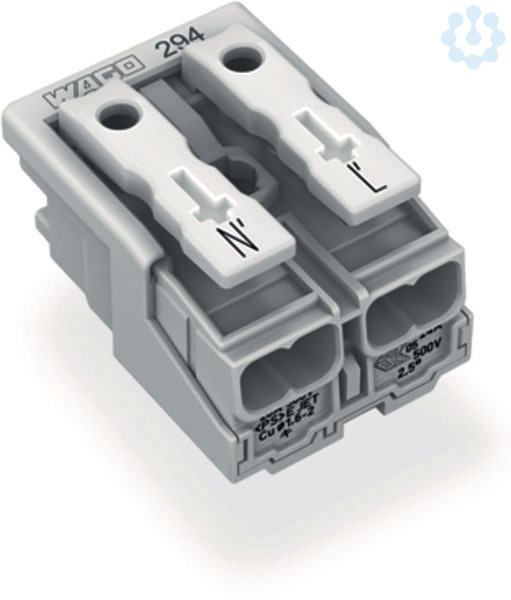 Leuchtenanschlussklemme; Drücker extern; ohne PE-Kontakt; N´-L´; 2-polig; Leuchtenseite: für eindrähtige Leiter; Inst.-Seite: für alle Leiterarten; max. 2,5 mm²; Umgebungstemperatur max. 85 °C (T85); 2,50 mm²; weiß