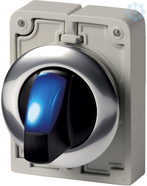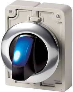 Leuchtwahltaste, Sortiment: RMQ-Titan, Einzelgerät, Bauform: mit Knebelgriff, tastend, 2 Stellungen, Farbe Knebelgriff: blau, Schutzart: IP64, Frontring Metall, Anbindung an SmartWire-DT: ja, mit RMQ-SWD-Anschaltungen, Frontabmessung: Ø 36 mm, Hinweise: Rast-/Tastfunktion mit Codierteilen M22-XC-Y veränderbar, Normen und Bestimmungen: IEC/EN 60947, VDE 0660, Schutzart: IP64