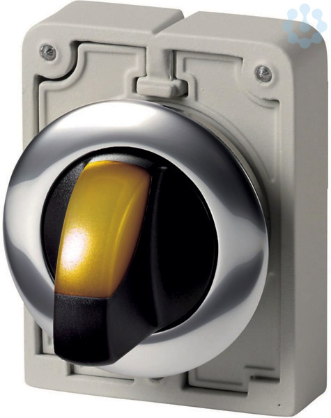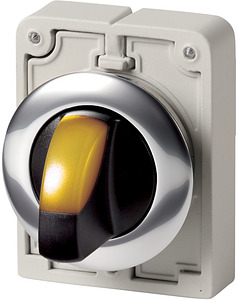 Leuchtwahltaste, Sortiment: RMQ-Titan, Einzelgerät, Bauform: mit Knebelgriff, tastend, 2 Stellungen, Farbe Knebelgriff: gelb, Schutzart: IP64, Frontring Metall, Anbindung an SmartWire-DT: ja, mit RMQ-SWD-Anschaltungen, Frontabmessung: Ø 36 mm, Hinweise: Rast-/Tastfunktion mit Codierteilen M22-XC-Y veränderbar, Normen und Bestimmungen: IEC/EN 60947, VDE 0660, Schutzart: IP64
