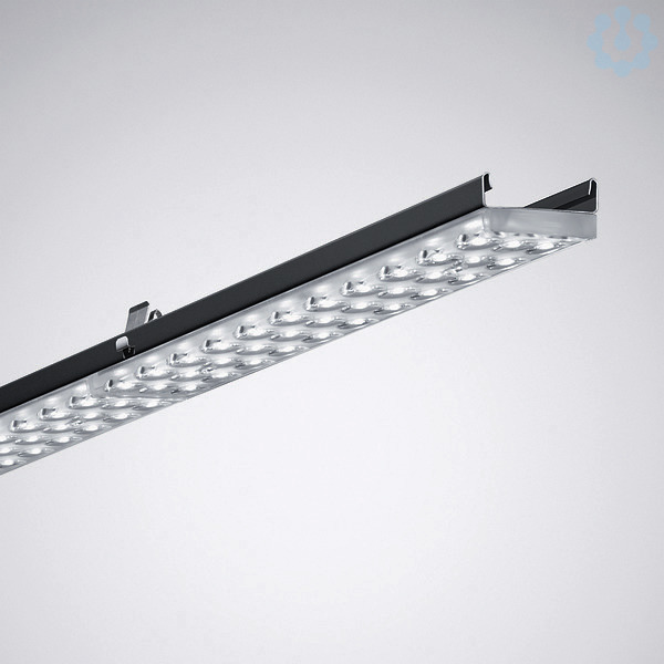 LED-Geräteträger für E-Line Lichtbandsystem. Verpackungseinheit: 4 x 7650B LED4000-830 ET 05 (TOC 6956640). Erfüllt DIN 10500. Die Leuchten sind für die Anwendungen in HACCP, IFS Version 6 und/oder BRC Global Standard Food Version 7 zertifizierten Unternehmen der Lebensmittel- und Getränkeindustrie geeignet. Für TRILUX E-Line T5N/LED oder T8 Universal Tragprofile, T5-Anwendungen ...35-...(1475 mm), T8-Anwendungen ...58-...(1530 mm) mit Blindabdeckung L55. Blindabdeckung zum Längenausgleich bei T8-Nachrüstungsanwendungen als separat zu bestellendes Zubehör verfügbar. Befestigung am Tragprofil durch werkzeuglos zu betätigende Edelstahl-Rastverschlüsse. Die Ausführung der vier Rastverschlüsse ermöglicht eine visuelle Kontrolle der sicheren Einrastung des Geräteträgers in das Tragprofil. Mit symmetrisch breit strahlender Lichtstärkeverteilung. Die PMMA-Linsenoptik bildet eine fest verbundene Einheit mit jeweils einem LED-Segment. Blendungsbewertung nach UGR-Einstufung (EN 12464-1) < 22. Oberfläche der Linsenoptik zur gleichmäßigen Lichtverteilung und homogenen Ausleuchtung der Lichtaustrittsöffnung plan ausgeführt. Die plane Oberfläche erleichtert Reinigungsvorgänge an der Leuchte. LED-System bestehend aus 5 LED-Segmenten. Je Segment mit 33 Mid-Power LED in 3 Reihen mit jeweils 11 LED bestückt. Bemessungslichtstrom 4100 lm, Bemessungsleistung 26,00 W, Leuchten-Lichtausbeute 157 lm/W. Lichtfarbe warmweiß, ähnlichste Farbtemperatur (CCT) 3000 K, Farborttoleranz (initial MacAdam) ≤ 3 SDCM, allgemeiner Farbwiedergabeindex (CRI) Ra > 80. Mittlere Bemessungslebensdauer L80(tq 50 °C) = 70.000 h, mittlere Bemessungslebensdauer L85(tq 50 °C) = 50.000 h. Geräteträger aus Stahlblech. Oberfläche schwarz beschichtet (RAL 9005). Maße (L x B): 1475 mm x 63 mm. 75 mm maximale Breite durch Verschlusstechnik. Zulässige Umgebungstemperatur (ta): -25 °C - +50 °C. Schutzklasse (EN 61140): I, Schutzart (DIN EN 60529): IP20, Stoßfestigkeitsgrad nach IEC 62262: IK06, Prüftemperatur Glühdrahttest gemäß IEC 60695-2-11: 650 °C. Selbsttätige elektrische Verbindung durch Steckkontakte mit Phasenwahl. Die Phasenwahl erfolgt werkzeuglos. Mit elektronischem Betriebsgerät, schaltbar. Das Produkt erfüllt die grundlegenden Anforderungen der anwendbaren EU-Richtlinien und des Produktsicherheitsgesetzes und trägt die CE-Kennzeichnung. Zusätzlich ist die Leuchte durch eine unabhängige Prüfstelle ENEC-zertifiziert.