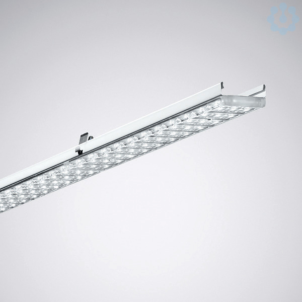 LED-Geräteträger für E-Line Lichtbandsystem. Erfüllt DIN 10500. Die Leuchten sind für die Anwendungen in HACCP, IFS Version 6 und/oder BRC Global Standard Food Version 7 zertifizierten Unternehmen der Lebensmittel- und Getränkeindustrie geeignet. Geeignet zur Anwendung in HACCP, IFS Version 6 und/oder BRC Global Standard Food Version 7 zertifizierten Unternehmen (DIN 10500). Für TRILUX E-Line T5N/LED oder T8 Universal Tragprofile, T5-Anwendungen ...35-...(1475 mm), T8-Anwendungen ...58-...(1530 mm) mit Blindabdeckung L55. Blindabdeckung zum Längenausgleich bei T8-Nachrüstungsanwendungen als separat zu bestellendes Zubehör verfügbar. Befestigung am Tragprofil mittels Drehriegelverschlüssen. Die PMMA-Linsenoptik bildet eine fest verbundene Einheit mit jeweils einem LED-Segment. Mit doppelt asymmetrisch strahlender Lichtstärkeverteilung. Oberfläche der Linsenoptik zur gleichmäßigen Lichtverteilung und homogenen Ausleuchtung der Lichtaustrittsöffnung plan ausgeführt. Die plane Oberfläche erleichtert Reinigungsvorgänge an der Leuchte. LED-System bestehend aus 5 LED-Segmenten. Je Segment mit 33 Mid-Power LED in 3 Reihen mit jeweils 11 LED bestückt. Bemessungslichtstrom 12600 lm, Bemessungsleistung 80,00 W, Leistungsfaktor λ > 0,95, Leuchten-Lichtausbeute 157 lm/W. Lichtfarbe neutralweiß, ähnlichste Farbtemperatur (CCT) 4000 K, Farborttoleranz (initial MacAdam) ≤ 3 SDCM, allgemeiner Farbwiedergabeindex (CRI) Ra > 80. Mittlere Bemessungslebensdauer L80(tq 35 °C) = 70.000 h, mittlere Bemessungslebensdauer L85(tq 35 °C) = 50.000 h. Geräteträger aus Aluminium, Oberfläche silbergrau beschichtet (RAL 9006). Maße (L x B): 1475 mm x 63 mm. Gewicht: 2,5 kg. Zulässige Umgebungstemperatur (ta): -25 °C - +35 °C. Schutzklasse (EN 61140): I, Schutzart (DIN EN 60529): IP20, Stoßfestigkeitsgrad nach IEC 62262: IK06, Prüftemperatur Glühdrahttest gemäß IEC 60695-2-11: 650 °C. Selbsttätige elektrische Verbindung durch Steckkontakte mit Phasenwahl. Die Phasenwahl erfolgt werkzeuglos. Mit elektronischem Betriebsgerät, schaltbar. Das Produkt erfüllt die grundlegenden Anforderungen der anwendbaren EU-Richtlinien und des Produktsicherheitsgesetzes und trägt die CE-Kennzeichnung.