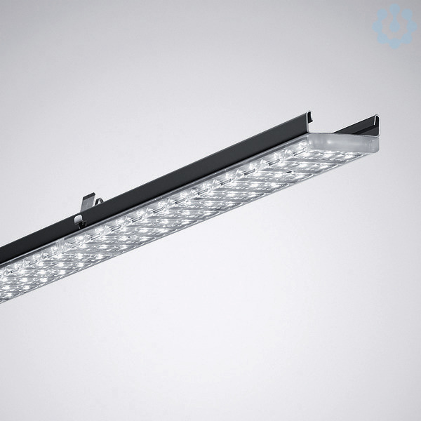 LED-Geräteträger für E-Line Lichtbandsystem. Verpackungseinheit: 4 x 7650DA LED6500-830 ETDD 05 (TOC 6955451). Erfüllt DIN 10500. Die Leuchten sind für die Anwendungen in HACCP, IFS Version 6 und/oder BRC Global Standard Food Version 7 zertifizierten Unternehmen der Lebensmittel- und Getränkeindustrie geeignet. Für TRILUX E-Line T5N/LED oder T8 Universal Tragprofile, T5-Anwendungen ...35-...(1475 mm), T8-Anwendungen ...58-...(1530 mm) mit Blindabdeckung L55. Blindabdeckung zum Längenausgleich bei T8-Nachrüstungsanwendungen als separat zu bestellendes Zubehör verfügbar. Befestigung am Tragprofil durch werkzeuglos zu betätigende Edelstahl-Rastverschlüsse. Die Ausführung der vier Rastverschlüsse ermöglicht eine visuelle Kontrolle der sicheren Einrastung des Geräteträgers in das Tragprofil. Mit doppelt asymmetrisch strahlender Lichtstärkeverteilung. Die PMMA-Linsenoptik bildet eine fest verbundene Einheit mit jeweils einem LED-Segment. Oberfläche der Linsenoptik zur gleichmäßigen Lichtverteilung und homogenen Ausleuchtung der Lichtaustrittsöffnung plan ausgeführt. Die plane Oberfläche erleichtert Reinigungsvorgänge an der Leuchte. LED-System bestehend aus 5 LED-Segmenten. Je Segment mit 33 Mid-Power LED in 3 Reihen mit jeweils 11 LED bestückt. Bemessungslichtstrom 6400 lm, Bemessungsleistung 41,00 W, Leuchten-Lichtausbeute 156 lm/W. Lichtfarbe warmweiß, ähnlichste Farbtemperatur (CCT) 3000 K, Farborttoleranz (initial MacAdam) ≤ 3 SDCM, allgemeiner Farbwiedergabeindex (CRI) Ra > 80. Mittlere Bemessungslebensdauer L80(tq 40 °C) = 70.000 h, mittlere Bemessungslebensdauer L85(tq 40 °C) = 50.000 h. Geräteträger aus Stahlblech. Oberfläche schwarz beschichtet (RAL 9005). Maße (L x B): 1475 mm x 63 mm. Zulässige Umgebungstemperatur (ta): -25 °C - +40 °C. Schutzklasse (EN 61140): I, Schutzart (DIN EN 60529): IP20, Stoßfestigkeitsgrad nach IEC 62262: IK06, Prüftemperatur Glühdrahttest gemäß IEC 60695-2-11: 650 °C. Selbsttätige elektrische Verbindung durch Steckkontakte mit Phasenwahl. Die Phasenwahl erfolgt werkzeuglos. Mit elektronischem Betriebsgerät, digital dimmbar (DALI). Die Leuchte ist Monitoring ready (MOR), liefert Leuchtendaten zur Überwachung oder vorausschauenden Wartung und ist damit kompatibel zu den TRILUX Digital Services (Energy Monitoring und Light Monitoring). Das Produkt erfüllt die grundlegenden Anforderungen der anwendbaren EU-Richtlinien und des Produktsicherheitsgesetzes und trägt die CE-Kennzeichnung. Zusätzlich ist die Leuchte durch eine unabhängige Prüfstelle ENEC-zertifiziert.