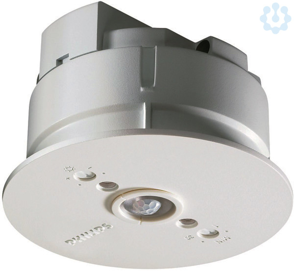 Anwesenheitssensor, basierend auf der Passiv-Infrarot (PIR) Technologie. Tageslichtabhängiges Schalten; über DIP-Schalter aktivierbar. Integriertes Schaltrelais für eine Last bis zu 1380 VA. Gehäuse aus Polycarbonat (Weiß, RAL 9010) für Deckeneinbau. Elektrischer Anschluss über Schraubkontakte