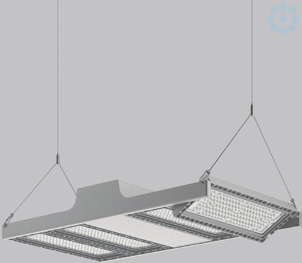 Flacher Hallenstrahler für Ketten- oder Seilabhängung mit 4 schwenkbaren LED-Modulen. Gehäuse Aluminium-Druckguss und Stahlblech pulverbeschichtet. Optimiertes Thermomanagement durch spezielles Leuchtendesign. Selbstreinigender Kühlkörper für konstante Wärmeableitung. Abdeckung Kunststoff (Polycarbonat) mit integriertem vierreihigen Linsensystem. LED-Module ± 30° schwenkbar für optimale Ausleuchtung. Pendelabhängung über Kette oder Stahlseil bauseits. Mit 5-poliger Anschlussleitung (1,5 m). Auf Wunsch kann die Leuchte auch mit Sensoren wie z.B. Bewegungsmelder oder Lichtsensor für Tageslichtregelung ausgestattet werden. Leuchten mit begrenzter Oberflächentemperatur nach DIN EN 60598-2-24 zur Verwendung in einer Umgebung, in der eine Ablagerung von leitfähigem Staub auf der Leuchte erwartet werden kann. DALI-Konverter gleichspannungstauglich - geeignet für zentrale Notstromversorgung.