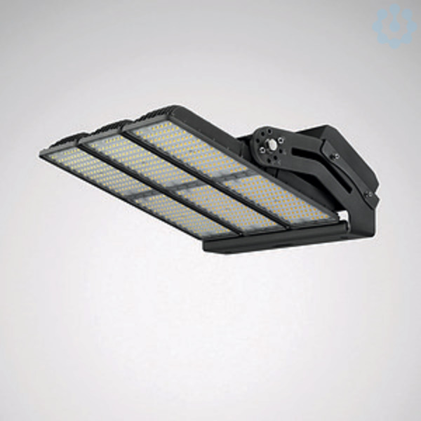 LED-Flutlichtstrahler für Flächenbeleuchtung. Für Mastaufsatzmontage. Schwenkbereich 0°, 5°, 10, 15°. Zur Befestigung der Leuchte an Maste in Einzel- oder Mehrfachanordnung ist diese der Anwendung entsprechend mit separat zu bestellendem Zubehör (Traversen) zu ergänzen. Mit spezieller, insbesondere für Planflächenanwendungen ausgelegter Linsenoptik. Mit asymmetrisch tief strahlender Lichtstärkeverteilung. Bemessungslichtstrom 120000 lm, Bemessungsleistung 1.100,00 W, Leuchten-Lichtausbeute 109 lm/W. Lichtfarbe warmweiß, ähnlichste Farbtemperatur (CCT) 3000 K, allgemeiner Farbwiedergabeindex (CRI) Ra > 70. Farborttoleranz (initial MacAdam) ≤ 5 SDCM. Mittlere Bemessungslebensdauer L80(tq 25 °C) = 100.000 h. Strahlergehäuse aus Aluminium-Druckguss. Abdeckung Lichtaustrittsöffnung aus Einscheiben-Sicherheitsglas. Farbe Leuchtenkörper anthrazit, ähnlich DB 703, pulverbeschichtet. (DB 703). Schutzklasse (EN 61140): I, Schutzart (DIN EN 60529): IP66, Stoßfestigkeitsgrad nach IEC 62262: IK08. Windangriffsfläche fw . Gewicht: 43,0 kg. Elektroblock mit 6 elektronischen Betriebsgeräten, digital dimmbar (DALI). Betriebsgerät gemäß DALI-2-Standard (EN 62386). Das Betriebsgerät ist entsprechend der Ökodesign-Anforderungen (VO (EU) 2019/2020) austauschbar. Anzahl der belegten DALI Teilnehmer: 6. Bestelleinheit besteht aus einem Leuchtengehäuse sowie einem separat verpackten Elektroblock. Stoßspannungsfestigkeit Differential Mode / Common Mode: 6 kV / 10 kV. Das Produkt erfüllt die grundlegenden Anforderungen der anwendbaren EU-Richtlinien und des Produktsicherheitsgesetzes und trägt die CE-Kennzeichnung. Zusätzlich ist die Leuchte durch eine unabhängige Prüfstelle ENEC-zertifiziert.