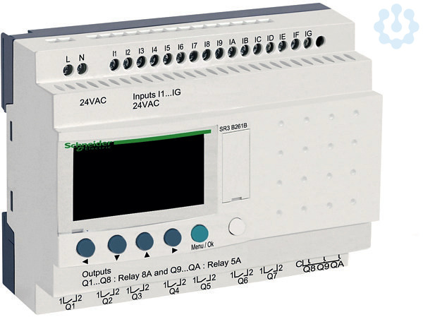 SPS-Steuerrelais Zelio Logic in modularer Ausführung, optional erweiterbar mit E/A-Modulen. Die Kleinsteuerung (Logikmodul) ist für einfache Automatisierungsaufgaben ausgelegt und bietet eine Alternative zu klassischen Schützsteuerungen oder kundenspezifischen Platinenlösungen. Mit integriertem Display und Tasten, die eine Programmierung direkt am Gerät in Kontaktplan (KOP) ermöglichen. Insgesamt 26 integrierte E/A, davon 16 digitale Eingänge, 10 digitale Ausgänge. Die Spannungsversorgung erfolgt über 24VAC. Die digitalen Ausgänge sind als Relais ausgeführt. Mit intergrierter Uhr. Schutzart Klemmleiste IP20, Schutzart Frontplatte IP54. Montage auf 35mm Hutschiene. Programmierung mittels kostenfreier Software Zelio Soft in Kontaktplan (KOP), Funktionsbausteinsprache oder GRAFCET Ablaufsprache. Download unter www.se.com. Zertifiziert nach CE, cULus Listed, CSA, GL, GOST, C-Tick.