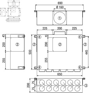 Luftverteiler-Kasten aus Blech mit schallgedämmer Innenauskleidung. Frontblechplatte versehen mit integrierten Kunststoff-Einschubadaptern MF-WE für den passgenauen und schnellen Einschub der Flexrohre MF-F. Bei der Auslieferung sind jeweils die Hälfte der Einschubadapter mit Verschlusskappen versehen. Ausgestattet mit 4 Gummi-Befestigungswinkeln für schallentkoppelte Wand-/ Deckenmontage. 3 demontierbare Revisionsanschlussplatten (2 x seitlich, 1 unten am Verteilerkasten). Stirnseitiger Hauptrohranschluss (NW 125/NW 160) kann versetzt werden auf Revisionsanschlussplatten. Einsatz als Durchgangs-bzw. 90°-Verteiler. Notwendiges Zubehör: Dichtungsringe MF-FDR.Artikel: MF-BV75-160-12, Luftrichtung: Be- oder Entlüftung, Volumenstrom: 360 m3/h / empfohlen, Material: Stahlblech, verzinkt, Gewicht: 11,18 kg, Gewicht mit Verpackung: 13,12 kg, Anschlussdurchmesser: 160 mm, Anschlussdurchmesser Flexrohr: 75 mm, Anzahl Anschlussstutzen: 12, Breite: 650 mm, Höhe: 200 mm, Tiefe: 500 mm, Breite mit Verpackung: 670 mm, Höhe mit Verpackung: 225 mm, Tiefe mit Verpackung: 540 mm