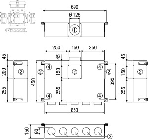Luftverteiler-Kasten aus Blech mit schallgedämmer Innenauskleidung. Frontblechplatte versehen mit integrierten Kunststoff-Einschubadaptern MF-WE für den passgenauen und schnellen Einschub der Flexrohre MF-F. Bei der Auslieferung sind jeweils die Hälfte der Einschubadapter mit Verschlusskappen versehen. Ausgestattet mit 4 Gummi-Befestigungswinkeln für schallentkoppelte Wand-/ Deckenmontage. 3 demontierbare Revisionsanschlussplatten (2 x seitlich, 1 unten am Verteilerkasten). Stirnseitiger Hauptrohranschluss (NW 125/NW 160) kann versetzt werden auf Revisionsanschlussplatten. Einsatz als Durchgangs-bzw. 90°-Verteiler. Notwendiges Zubehör: Dichtungsringe MF-FDR.Artikel: MF-BV90-125-5, Luftrichtung: Be- oder Entlüftung, Volumenstrom: 250 m3/h / empfohlen, Material: Stahlblech, verzinkt, Gewicht: 9,38 kg, Gewicht mit Verpackung: 10,91 kg, Anschlussdurchmesser: 125 mm, Anschlussdurchmesser Flexrohr: 90 mm, Anzahl Anschlussstutzen: 5, Breite: 650 mm, Höhe: 150 mm, Tiefe: 450 mm, Breite mit Verpackung: 670 mm, Höhe mit Verpackung: 175 mm, Tiefe mit Verpackung: 520 mm