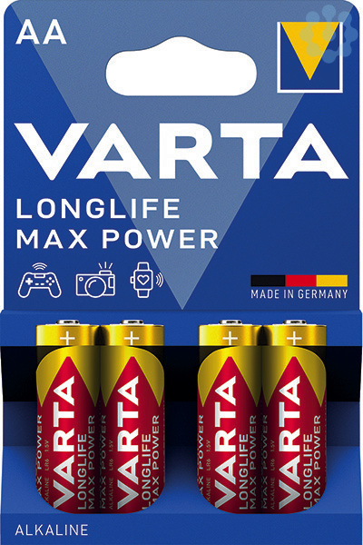Longlife MAX POWER, die beste Premiumbatterie für High-End-Geräte. Die High-Tech-Batterie für digitale Geräte und Hochleistungsgeräte wie Digitalkameras, Blitzgeräte, MP3-Player, Comuterzubehör etc. .Longlife MAX POWER, High Tech Made in Germany. Ideal für Geräte mit hohem und schnell wechselndem Energiebedarf. Die VARTA Longlife MAX POWER liefert eine flexible Energieabgabe, abgestimmt auf High Tech-Geräte, z. B. Digitalkameras, Blitzgeräte, Minidisc-Player, elektronische Diktiergeräte, Taschencomputer etc. . Präzise Energie für die wechselnden Anforderungen von High-Tech-Geräten, ein spezielles Zinkpulver liefert präzise Energie, die speziell auf den Bedarf der anspruchsvollen Geräte abgestimmt wurde.