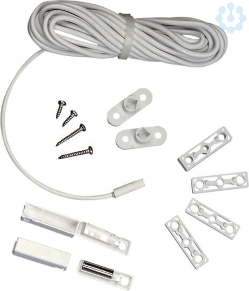 zur Öffnungsüberwachung von Fenstern, Türen komplett zum Aufschrauben oder Einbohren. Inhalt: 1 Magnet, 1 Reedkontakt mit 4,0 m Anschlusskabel LIYY 4 x 0,14 mm2, 2 Gehäuse, 2 Distanzplatten, 2 Flansche, 4 Befestigungsschrauben antimagnetisch. VdS-Nr. G 191549. VdS Kl. B.