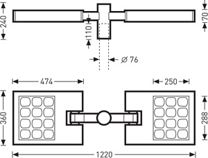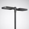 LED-Mastaufsatzleuchte in Zweifachanordnung. Mit autarker Leistungsreduzierung über integrierte Auswerteelektronik. Reduzierung des Leuchtenlichtstroms auf 50 % für einen Zeitraum von 7 Stunden (-2h/+5h). Für Mastaufsatzmontage. Für Mastzopf Ø 76 mm. Optisches System aus satinierten Kunststoffreflektoren mit integrierten LED-Modulen. Mit asymmetrisch breit strahlender Lichtstärkeverteilung. LED-System bestehend aus 12 Hochleistungs-LED. Bemessungslichtstrom 3600 lm, Bemessungsleistung 36,00 W, Leuchten-Lichtausbeute 100 lm/W. Lichtfarbe neutralweiß, ähnlichste Farbtemperatur (CCT) 4000 K, allgemeiner Farbwiedergabeindex (CRI) Ra > 70. Farborttoleranz (initial MacAdam) ≤ 5 SDCM, Mittlere Bemessungslebensdauer LCLO(tq 25 °C) = 80.000 h. Leuchtenkörper aus Aluminium-Strangpressprofil und Aluminium-Druckgusskomponenten. Farbe des Leuchtengehäuses anthrazit, ähnlich DB 703, mit Metalleffekt, pulverbeschichtet, hochwetterfest. Seewetter geeignete Beschichtung auf Anfrage. Abdeckscheibe aus planem, wärmebehandeltem Einscheiben-Sicherheitsglas (ESG-H), teilsatiniert. Gewicht: 18,7 kg. Schutzklasse (EN 61140): II, Schutzart (DIN EN 60529): IP65, Schutzart Lampenraum: IP65, Stoßfestigkeitsgrad nach IEC 62262: IK04. Mit elektronischem Betriebsgerät, schaltbar. Parametrierbares Vorschaltgerät mit Lichtstromkonstanthaltung (CLO). Anschlussleistung am Ende der Lebensdauer: 38,00 W. Das Produkt erfüllt die grundlegenden Anforderungen der anwendbaren EU-Richtlinien und des Produktsicherheitsgesetzes und trägt die CE-Kennzeichnung.