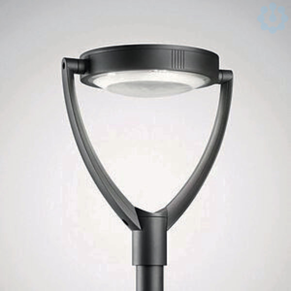 Dekorative Mastaufsatzleuchte mit gewölbter, hochschlagzäher PMMA-Abschlusswanne, Mastaufsatz parabolförmig. Mit intelligentem Label zum schnellen Aufrufen von Leuchten-Informationen mittels QR-Code. Mastaufsatzleuchte für Mastzopf Ø 76 mm, Die Mastbefestigung erfolgt mit zwei Befestigungsschrauben nach EN 60598-2-3 aus Edelstahl. Mittels separat zu bestellender Reduzierstücke auch zur Montage an Masten mit Zopf Ø 60 mm geeignet. Passender Mast auf Anfrage. Optisches System in Multi-Lens-Technologie (MLT) ausgeführt. Leuchtenoptik bestehend aus hocheffizienten, UV- und temperaturbeständigen Linsensystemen. Mit asymmetrisch breit strahlender Lichtstärkeverteilung. Optimiert für eine horizontale Ausrichtung des Leuchtenkörpers. Zur flexiblen Anpassung an kundenspezifische Beleuchtungsaufgaben stehen weitere Abstrahlcharakteristiken zur Verfügung. Der nachträgliche Einbau einer rückseitigen / seitlichen Abschirmung ist als separat zu bestellendes Zubehör möglich. Mit 6 LED-Modulen. LED-Modul bestehend aus vier LEDs, inklusive optischem System. Bemessungslichtstrom 3800 lm, Bemessungsleistung 37,00 W, maximale Leuchten-Lichtausbeute 103 lm/W. Lichtfarbe neutralweiß, ähnlichste Farbtemperatur (CCT) 4000 K, allgemeiner Farbwiedergabeindex (CRI) Ra > 70. Farborttoleranz (initial MacAdam) ≤ 5 SDCM. Weitere LED-Lichtfarben auf Anfrage verfügbar. Mittlere Bemessungslebensdauer LCLO(tq 25 °C) = 100.000 h. Die Lichtquelle ist entsprechend der Ökodesign-Anforderungen (VO (EU) 2019/2020) austauschbar. Leuchtenkörper aus Aluminium-Druckguss. Farbe anthrazit (DB 703). Seewetter geeignete Beschichtung auf Anfrage. Neigungswinkel einstellbar Einstellung in 10°-Schritten zwischen 0° und 90° arretierbar. Mit gewölbter Abschlusswanne aus hochschlagzähem PMMA. Schutzklasse (EN 61140): II, Schutzart (DIN EN 60529): IP23, Schutzart Lampenraum: IP66, Stoßfestigkeitsgrad nach IEC 62262: IK08. Mast auf Anfrage erhältlich. Windangriffsfläche fw 0,080 m2. Gewicht: 8,7 kg. Geräteträger mit allen elektrischen Komponenten und LED-Modulen als oberer Leuchtenabschluss montiert. Nach Lösen von vier Befestigungsschrauben aus V2A abnehmbar. Mit Betriebsgerät, digital dimmbar (DALI). Betriebsgerät gemäß DALI-2-Standard (EN 62386). Das Betriebsgerät ist entsprechend der Ökodesign-Anforderungen (VO (EU) 2019/2020) austauschbar. Stoßspannungsfestigkeit Differential Mode / Common Mode: 6 kV / 10 kV. Das Produkt erfüllt die grundlegenden Anforderungen der anwendbaren EU-Richtlinien und des Produktsicherheitsgesetzes und trägt die CE-Kennzeichnung. Zusätzlich ist die Leuchte durch eine unabhängige Prüfstelle ENEC-zertifiziert.
