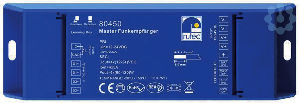 Der Funkempfänger kann 1-4 farbige LEDs ansteuern Die Synchronisierung der Funkempfänger erfolgt über einen 3-poligen Datenbus welcher bis zu 30 m von Controller zu Controller geführt werden kann für die Innenanwendung Material: Kunststoff Schutzart: IP20 Schutzklasse III, CE, RoHS, REACH Betriebsspannung: 12V oder 24 V DC Leistung: 4 x 60 W bei 12 V / 4 x 120 W bei 24V Empfangsfrequenz: 868 MHz maximaler Kabelquerschnitt am Klemmstein: 1,5 qmm Synchronisierung über 3 poligen Datenbus mit Memory-Effekt bis zu 8 Handsender speicherbar Potentialfreier Tastereingang zum Schalten und Dimmen (nur einfarbig)
