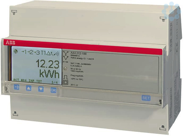 Drehstromzähler zur Messung eines Dreileiter- oder Vierleiter-Drehstromnetzes über einen Wandler-Anschluss CTVT (Wandlerverhältnis für Strom und Spannung konfigurierbar) bis maximal 6 A. Folgende Werte werden über ein weiß hinterleuchtetes Display mit bis zu 7 Stellen ausgegeben: Wirkenergie (Klasse 1) und Blindenergie (Klasse 2) für Import und Export, Leistungen, Ströme, Spannungen (L-L, L-N), Frequenz, cos phi, Power Faktor und Scheinleistung, sowohl je Phase als auch gesamt. Die Kommunikation kann über die integrierte Schnittstelle RS485 (Modbus RTU) oder über die Infrarotschnittstelle zur Anbindung eines KNX-Moduls erfolgen. Der Energiezähler hat einen Ausgang. Dieser kann wahlweise als Impulsausgang zur Ausgabe der Wirk- bzw. Blindenergie oder als Alarmausgang verwendet werden. Hier können bis zu 25 Alarmwerte (Schwellwerte mit Zeitverzögerung) eingestellt werden. Zähler ist geeicht nach MID und zugelassen gemäß IEC. Die Einbaubreite beträgt 7 DIN-Module.