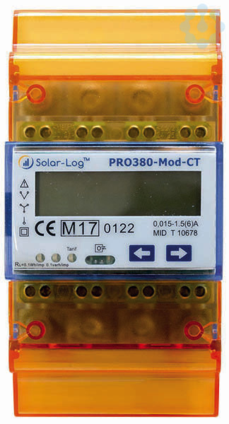 Der Solar-Log™ PRO380-CT Zähler ist ein 3-phasiger MID geeichter Messwandlerzähler mit folgenden Schnittstellen: 2x S0, 1x RS485 (Modbus). Zudem hat er einen Wandlereingang mit maximal 6 A. Die Nennspannung beträgt 230/400 VAC. Der Eigenstromverbrauch liegt bei ≤ 2 W/Phase - ≤ 10VA/Phase. Die Nennnetzfrequenz beträgt 50 Hz. Dieser Zähler hat einen maximalen Kabelquerschnitt von 10 mm2 bzw. 2,5 mm2 (Zusatzklemmen).
