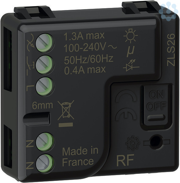 Funk-Mikromodul für Beleuchtung von "Valena with Netatmo" - Zur Installation direkt beim Lichtauslass. Ansteuerung durch einen oder mehrere drahtlose Funk-Wandsender und/oder aufgrund des vorhandenen Steuereingangs - auch mittels herkömmlicher Taster, wenn ein Fernschalter ersetzt wird. Zum Schalten von LED-, Halogen- und Kompakt-Leuchtstofflampen bis 300 W. Anschluss mit Neutralleiter.