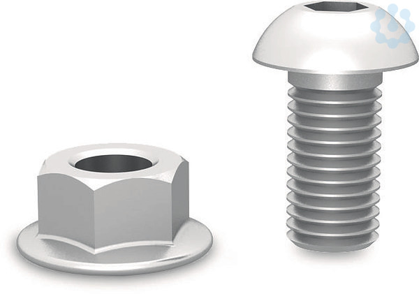 Set aus zwei Flachkopfschrauben und zwei Flanschmuttern zur Befestigung des MiniFive an der MiniRail. Material: Edelstahl (1.4301)