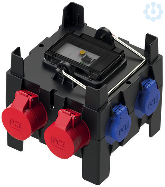 Kunstst.-Mobilverteiler Modell IMST IP44 197x197x200 6TE sw; 1xCEE-Gerätestecker 16A 5p 400V; 2xCEE-Steckdose 16A 5p 400V ungesichert; 4xSK-Steckdose 16A 250V IP54 ungesichert; 1xFI 40A/4/0.03A (TYP A 25AT) über alle Ausgänge; FI-Schutzschalter Marke PCE Ö+V; Verteiler anschlußfertig verdrahtet