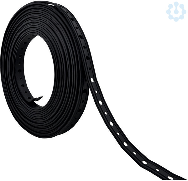 Montageband aus kunststoffummanteltem sendzimirverzinktem Stahl mit gleichmäßigen Lochbild befestigt Rohre und Luftkanäle, als 10-Meter-Rolle ohne Verpackung, Blechbandbreite 26 Millimeter, Blechbandstärke 3,2 Millimeter, Lochdurchmesser 8,5 Millimeter.