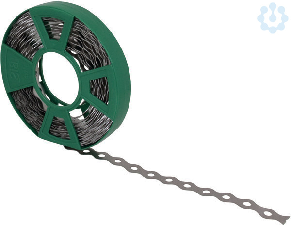 Montageband aus Edelstahl 1.4401 (AISI 316) mit gleichmäßigem Lochbild und gewellter Kante befestigt PVC-Rohre und andere Leitungen, als 10-Meter-Rolle in Abrollbox, Blechbandbreite 17 Millimeter, -stärke 0,8 Millimeter, Lochdurchmesser 7 Millimeter.