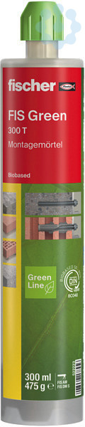 Der fischer Montagemörtel Green 300 T ist ein 2K-Injektionssystem auf Vinylesterbasis. Der Hybrid-Mörtel verfügt über eine Umwelt-Produktdeklaration EPD des Instituts für Bauen und Umwelt und wird mindestens zur Hälfte mit nachwachsenden Rohstoffen produziert. Weiter ist der Montagemörtle Green gemäß der französischen VOC-Verordnung in die bestmögliche Emissionsklasse A+ für flüchtige Stoffe eingestuft. Harz und Härter werden erst beim Auspressen aus dem Statikmischer vermischt und aktiviert. Die Kartusche kann mit einer handelsüblichen Silikon-Auspresspistole ausgepresst werden. Angebrochene Kartuschen können mit einem neuen Statikmischer wieder verwendet werden. Das Hybrid-System bietet mit Systemkomponenten wie Ankerstangen FIS A, Innengewindeankern und Injektions-Ankerhülsen für Befestigungen in Beton und Mauerwerk viele Anwendungsmöglichkeiten im Innen- und Außenbereich.