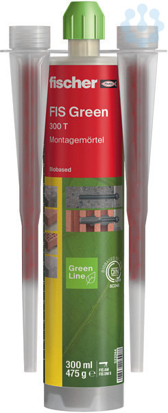 Der fischer Montagemörtel Green 300 T ist ein 2K-Injektionssystem auf Vinylesterbasis. Der Hybrid-Mörtel verfügt über eine Umwelt-Produktdeklaration EPD des Instituts für Bauen und Umwelt und wird mindestens zur Hälfte mit nachwachsenden Rohstoffen produziert. Weiter ist der Montagemörtle Green gemäß der französischen VOC-Verordnung in die bestmögliche Emissionsklasse A+ für flüchtige Stoffe eingestuft. Harz und Härter werden erst beim Auspressen aus dem Statikmischer vermischt und aktiviert. Die Kartusche kann mit einer handelsüblichen Silikon-Auspresspistole ausgepresst werden. Angebrochene Kartuschen können mit einem neuen Statikmischer wieder verwendet werden. Das Hybrid-System bietet mit Systemkomponenten wie Ankerstangen FIS A, Innengewindeankern und Injektions-Ankerhülsen für Befestigungen in Beton und Mauerwerk viele Anwendungsmöglichkeiten im Innen- und Außenbereich.